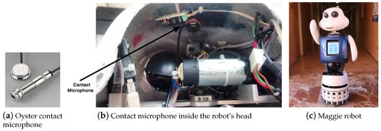 We have placed a contact microphone inside the robot’s head, more specifically, in the inner side of the fibreglass shell (see Figure 6b). Due to the fact that the internal part of the shell is concave and rough, it was necessary to use clay to achieve a smooth and homogeneous surface to maximize the contact between the microphones and the shell. A smooth fitting between the microphone and the shell is crucial to achieve a good sound acquisition.