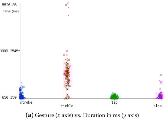 The role that the sense of touch plays in emotional communication in humans and animals have been widely studied, finding relations to attachment, bonding, stress and even memory [,]. Touch, as a common communicative gesture, is an important aspect of social interaction among humans []. Several works focus on using touch as a valid modality to ascertain the user’s intention, and claim about the evidence of the touch as a powerful way of communicating emotions. In this sense, Hertenstein [] found that anger, fear, disgust, love, gratitude, and sympathy are easier to detect than happiness and sadness.