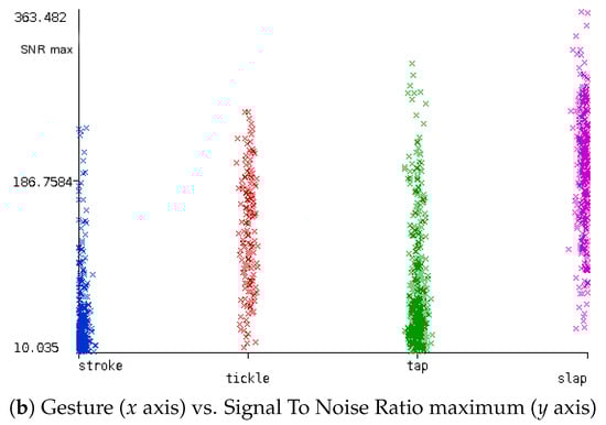 After gathering all data samples for the dataset, we performed a preliminary phase of analysis to check whether there were differences in the different touch-gestures collected. Figure 7a shows the durations in time of the different gestures. Here we can see how the tickle gestures tend to span a longer time period than the others. We also checked the relationship between each kind of gesture and the maximum SNR reached (see Figure 7b). SNR is related to the signal amplitude for each gesture, in other words, how strong a touch-gesture is with respect to the noise.