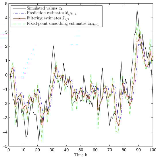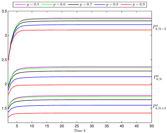 To illustrate the feasibility and effectiveness of the proposed algorithms, they were implemented in MATLAB (R2011b 7.13.0.564, The Mathworks, Natick, MA, USA) and one hundred iterations of the prediction, filtering and fixed-point smoothing algorithms have been performed. In order to analyze the effect of the network-induced uncertainties on the estimation accuracy, different values of the probabilities p of the Bernoulli random variables that model the uncertainties of the third and fourth sensors, and several values of the delay probabilities , , have been considered.