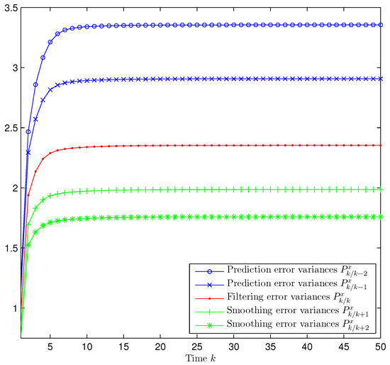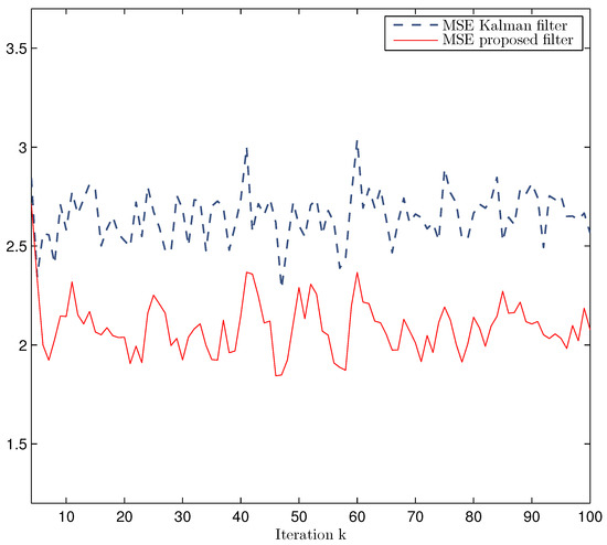 Performance of the Prediction, Filtering and Fixed-Point Smoothing Estimators. Considering the values , (packet arrival probability) and (delay probabilities), Figure 1 displays a simulated trajectory along with the prediction, filtering and smoothing estimations, showing a satisfactory and efficient tracking performance of the proposed estimators. Figure 2 shows the error variances of the predictors and , the filter and the smoothers and . Analogously to what happens for non-delayed observations, the performance of the estimators becomes better as more observations are used; that is, the error variances of the smoothing estimators are less than the filtering ones which, in turn, are less than those of the predictors. Hence, the estimation accuracy of the smoothers is superior to that of the filter and predictors and improves as the number of iterations in the fixed-point smoothing algorithm increases. The performance of the proposed filter has also been evaluated in comparison with the standard Kalman filter; for this purpose, the filtering mean square error (MSE) at each sampling time was calculated by considering one thousand independent simulations and one hundred iterations of each filter. The results of this comparison are displayed in Figure 3, which shows that the proposed filter performs better than the Kalman filter, a fact that was expected since the latter does not take into account either the uncertainties in the measured outputs or the delays and losses during transmission.