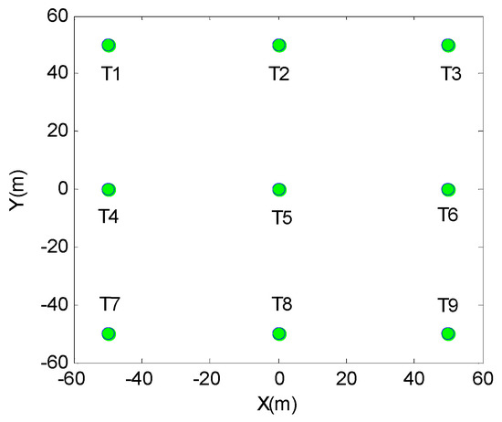 The positions of these scattering targets are shown in Figure 3. In the simulation, we set point target T5 as the reference center point. Point targets T4, T5, and T6 are located in the same azimuth direction and in different range directions, which means they have the same instantaneous Doppler frequency and different range cells. Point targets T2, T5, and T8 are located indifferent azimuth directions and in the same range direction, which means they have different instantaneous Doppler frequencies and the same range cell.
