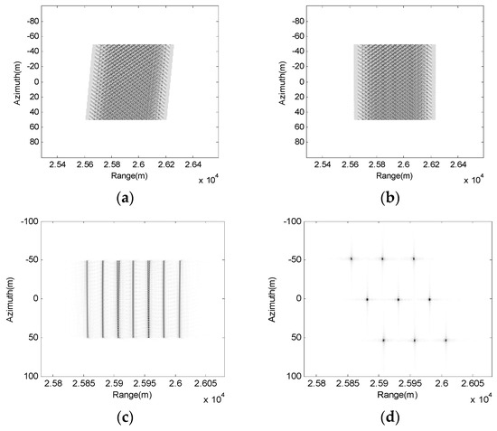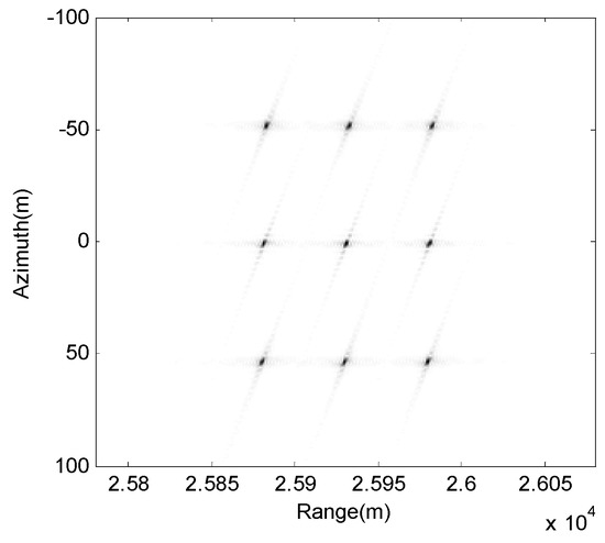 Figure 4 shows the point target spectrum and interim simulation results using the proposed method. Figure 4a indicates the raw data from which we can see the skew due to the range azimuth coupling. Figure 4b shows the data after LRWC. The data is flattened, thus, the following steps can be performed easier. Figure 4c depicts the results after range compression, RCMC, SRC, and high-order coupling compensation, where each point target response is focused in the same range cell. Figure 4d shows the results of these scattering targets after azimuth compression, and we can find the geometric distortion in the image due to the LRWC operation. The imaging result after geometric distortion correction is shown in Figure 5.