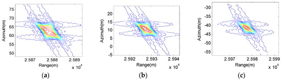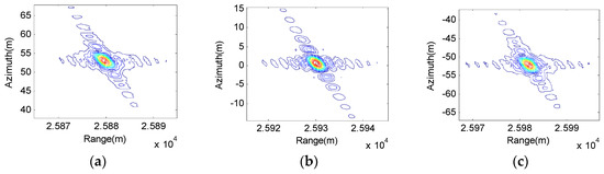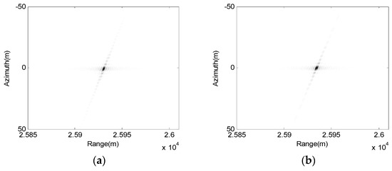 Secondly, the approximation of the 2-D frequency spectrum by the method of POSP and series reversion introduces the error. This error partly depends on the range approximation, namely, it is related to the first error. Another aspect is the remaining Taylor expansion orders of . In this algorithm, the 2-D frequency spectrum expansion of ignores the terms higher than fourth-order. To analyze this error, the method of numerical calculation is considered as a comparison, which can obtain the accurate 2-D frequency spectrum. Figure 7 shows the imaging results of point targets using the approximation of 2-D frequency spectrum derived in this paper and the method of numerical calculation, respectively.