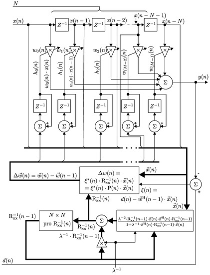 Figure 3 illustrates the block diagram of an adaptive FIR filter with spinal structure and implementation of the N-th order RLS algorithm.