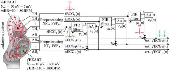 A theoretical multichannel adaptive noise cancellation system is shown in Figure 4. It consists of two kinds of the input signals recorded from multiple leads: the abdominal ECG signals (–) and the thoracic ECG signals (–). Each abdominal signal is used as the primary input and consists of both maternal () and fetal () signals. The thoracic signal is considered to be composed of only the maternal component and is used as the reference input. The Finite Impulse Response (FIR) filter weights of the adaptive systems are updated by the training algorithms (Adaptive Algorithms (AA)) based on the back propagated error signal (e), which is equal to the desired signal (–). The maternal component is considered to be noise for elimination, and it is therefore subtracted from the abdominal ECG signal (). After the subtraction step, the signal with some noise is recovered based on the backpropagation training. The diagram includes the pre-processing part, which is not included in our research since the data that are used for the fECGextraction are recorded by the devices that involve analog pre-processing. These data are therefore already filtered by using, e.g., the Notch Filter (NF) and Frequency Selective Filters (FSF). The filters used for maternal and abdominal leads are different because the frequency range of the signals ( and ) slightly differs, as well. Therefore, you might observe different examples of Notch filters (, ) and frequency selective filters (, ) for fetal and maternal signals, respectively.