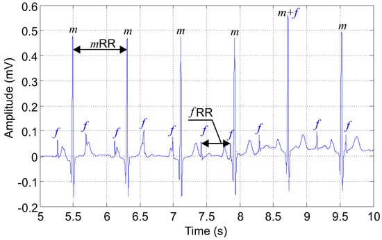 Here, we present examples of the input and output ECG signals used in our experiments. Figure 7 shows an example of an input signal fed to the adaptive system (filter). This ECG signal was recorded using the abdominal electrode AE002 (3M Corporate Headquarters, Maplewood, MN, USA) and contains both maternal and fetal components. Maternal and fetal R waves and the intervals between them (RR intervals, i.e., heart beats) are marked in the graph (m, maternal R wave; f, fetal R wave; , maternal RR interval; , fetal RR interval).