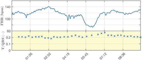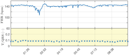 Below, we describe the simulation of a real-life monitoring scenario, where a fetal hypoxia occurs. In a 20 min-long recording, the first half simulates the healthy state of the fetus, while the second half illustrates the changes that occur in the waveform as a consequence of the fetus suffering from hypoxia. Figure 8 and Figure 9 show the physiological and pathological parts of the recording, respectively. The figures include the calculated values of (bpm) and T/QRS. This information corresponds to the visualization of the STanalysis by the Noeventa Medical ST analyzer (STAN S34). Please note that T/QRS [100,101] is calculated for 30 samples (for more information about T/QRS determination, please see [102,103]). The physiological is relatively constant and fluctuates around the value of 140 bpm and the value of T/QRS oscillates around the value of 0.1. This fluctuation simulated the Beat-To-Beat (BTB) variability, which is physiological. In other works [57,58,104], the authors used data that were periodical, which did not correspond with the real-life attributes of signals. The pathological (Figure 9) oscillates in the range of 70–140 bpm, while the T/QRS can fluctuate around the value of 0.2 or exceed it significantly.