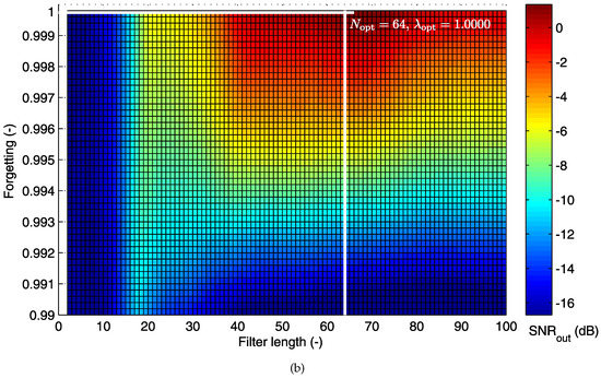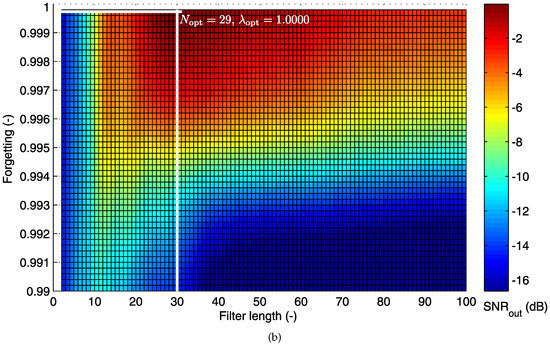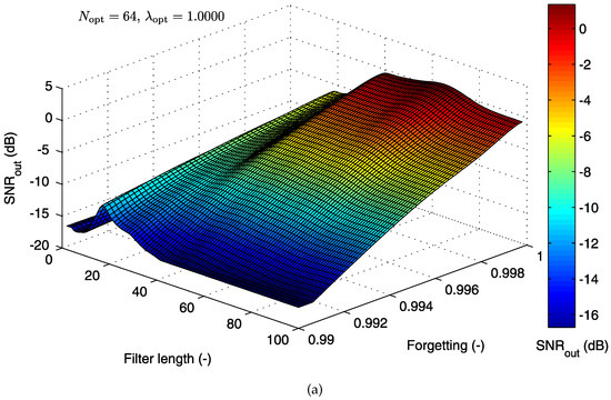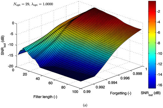 For implementation, the value of the “forgetting factor” is usually set in the range of . A small value of causes the filter to place more emphasis on the recent samples of the observed data and tends to forget the past [78]. For , i.e., , the mathematical expression of the RLS algorithm is reduced to the expression for the LMS algorithm.