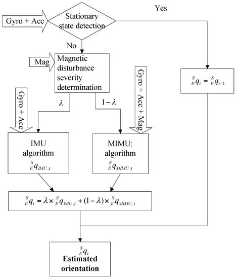The proposed method is a combination of the IMU algorithm and the MIMU algorithm. Overview of the proposed method’s structure is shown in Figure 1.