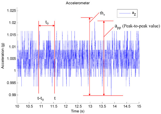 The stationary state criterion can be interpreted as that the variation of the measured acceleration along each axis is small than in an interval , which ensures the sensor’s orientation is unchanged in the period of . Figure 2 shows an example of collected z-axis acceleration in stationary state. determines the latency between the actual and the detected stationary state [27]. A long interval make the method insensitive to stationary state and a short interval may lead to frequent switching between dynamic and stationary state. The optimum should be determined by stationary detect test. can be determined according to accelerometer noise in theory, but the noise varies from sensor to senor, so it is more appropriate to choose by tuning experiments. As Figure 2 shows, can be calculated using Equation (12):