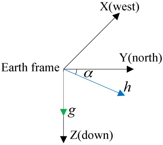 is regarded as an indicator of magnetic disturbances. When the magnetic disturbance is severe, the final orientation should trust more on and less on . Thus, the critical issue is to determine according to the current measured magnetic field. Generally, in a magnetic disturbances free environment, the Earth magnetic field should be a constant vector, where both the magnitude and dip angle are constants. Figure 3 shows the gravitational acceleration and geomagnetic field in the Earth frame.
