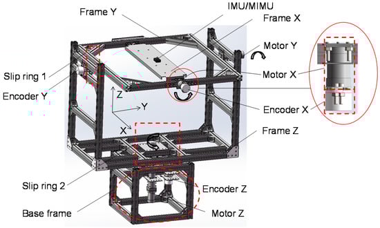 In order to evaluate the accuracy of different fusion algorithms, we designed an instrumented gimbal to perform this task. Compared with the traditional stereophotogrammetry, multi-axis gimbal provides a simple and controllable evaluation method by providing known orientations during dynamic movement. More and more literature reported to use the gimbal to benchmark the inertial sensors [30,31]. The gimbal used in our study contains three degrees of freedom (DOFs), corresponding with the three axes of Euler angles. As shown in Figure 4, the gimbal consists of a base frame and three rotatable frames: frame X, Y and Z. Each axis is equipped with a motor and an absolute encoder. The motor makes the frame can be controlled independently. The encoder is capable of outputting the angle around each axis at a resolution of . To make each axis rotate continuously, both the power cable and the signal cable are pass through slip rings to avoid cable wrapping problem. Moreover, the gimbal is equipped with a remote control, so that users can control the gimbal wirelessly.