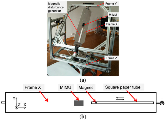 During the experiments, the MIMU was mounted on the testing area of frame X with double-sided tapes, and the X axis of the sensor was aligned with that of the gimbal (Figure 5a). A magnetic disturbance generator was installed beside the MIMU, which is used to simulate the magnetic disturbances in the surroundings. As shown in Figure 5b, the generator consists of a square paper tube and a circular permanent magnet (diameter: 15 mm, thickness: 2 mm). The tube was attached on frame X and the magnet was put into the tube. When frame Y rotated, the magnet would reciprocate in the paper tube due to the gravity. Such that the magnetic disturbance changed with the distance between the magnet and the MIMU.