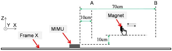 In this test, as shown in Figure 7, the MIMU was kept in stationary state on the test area of the frame X. In order to simulate the magnetic disturbances in the surroundings, a circular permanent magnet (diameter: 15 mm, thickness: 2 mm) was held over the MIMU and moved near and far away from the MIMU. The distance between the magnet and the MIMU was from 10 cm to 70 cm. The duration of each trial was about 110 s and each trial was repeated for five times. The collected data was used as the input of the original MIMU algorithm and the proposed adaptive method. The Euler angles estimated by the two algorithms were then compared.