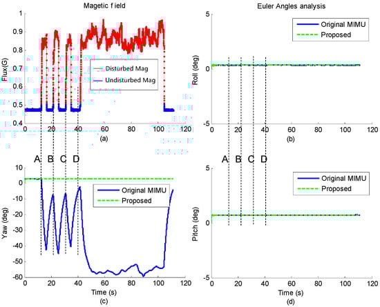 The magnetometer data in one of the trials is shown in Figure 8a. At time A, B and C, the magnet was moved close to the sensor and then removed after a few seconds, while at time D, the magnet was also moved close to the sensor but stayed for about one minute. It can be seen that as the permanent magnet got close to the MIMU, strong magnetic disturbance was detected by the magnetometer. The corresponding estimated Euler angles of the proposed method and the original MIMU fusion algorithm are shown in Figure 8b–d.