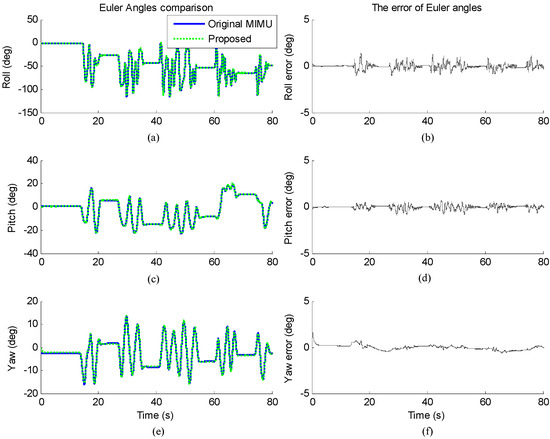 The orientation estimated by original MIMU algorithm (solid) and proposed method (dotted) in dynamic state. (a,c,e) Euler angles; (b,d,f) The error of Euler angles.
