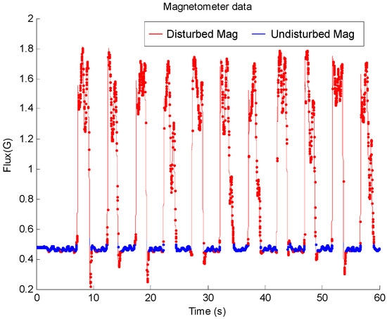 In one of the trails, the magnitude of the measured magnetic field is shown in Figure 10. The disturbed magnetic field is plot in red line, and it can be seen that strong magnetic disturbance occurred periodically. The proposed method calculated the weight of the IMU algorithm according to magnetic disturbance as described in Equations (15)–(17).