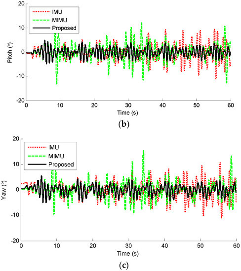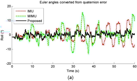 Euler angles converted from quaternion error among IMU algorithm, MIMU algorithm and proposed method from one example trial. (a) Roll angle; (b) Pitch angle; (c) Yaw angle.
