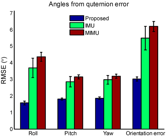 Figure 11 shows the Euler angles converted from quaternion error among IMU algorithm, MIMU algorithm and the proposed method. Although these angles are no longer related to earth frame, the error trends are clear. It can be seen from Figure 11a that the error of IMU algorithm increases gradually, which indicates that IMU algorithm is suffered from drift. The MIMU algorithm is seriously impacted by the magnetic disturbance. Taking pitch angle error as an example, the error increased to more than 10° sometimes. While for the proposed method, the error is relatively small and stable. Thus, the detrimental effect of magnetic disturbance has been suppressed significantly. The mean and standard deviation of the RMSEs of all the ten trials are calculated and plotted in Figure 12. It can be seen that the error of the proposed method is smaller than original MIMU and IMU fusion algorithm, which demonstrates that the special handling for magnetic disturbances in the proposed method is effective. The mean orientation error of the proposed, MIMU algorithm and IMU algorithm are 3.02°, 6.19° and 5.48° respectively, and hence the orientation error of the proposed method is reduced by 51.2% compared with original MIMU algorithm.