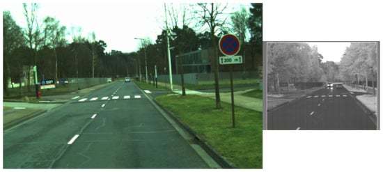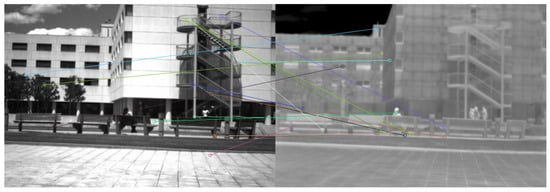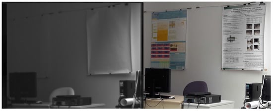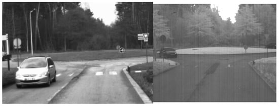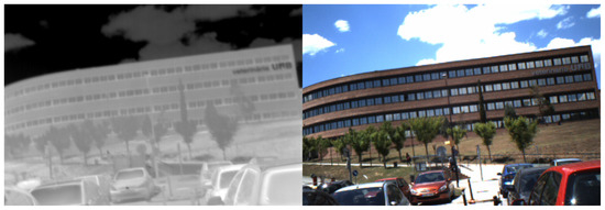 This part handles infrared images from a spectral range much further from visible spectrum than the previous one. We used the visible and Long-Wavelength InfraRed dataset introduced in [,]. This spectral range is appreciated for its thermal response and its possible usage as night vision system. This dataset encompasses outdoor view scenes of the Barcelona campus. Images from this dataset have also been rectified by their authors so that resolutions and viewpoints are the same. An instance from the dataset is given in Figure 18.