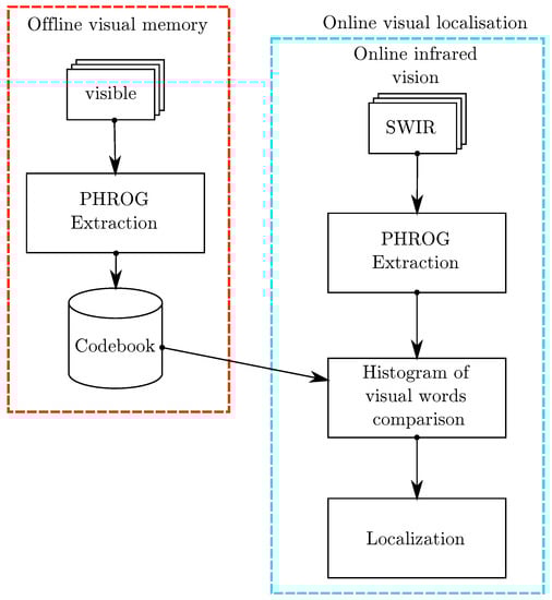 Dedicated to visual servoing, the method described in [] is a good example which focuses on mutual information on whole images for registration and tracking. In [], the authors use multimodal image registration at the heart of a SLAM process. Reference [] also proposes a multimodal approach involving visible and thermal imaging systems and claims its performances in daylight as well as at night. Nevertheless, both make use of two spectral ranges at the same time, that means using the same mix of information coming from a particular set of sensors at all times. In this paper, we put forth assumptions that the sensor set can change over time or between different agents and thus, the image retrieval process should be tolerant to these changes.