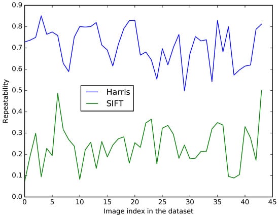 We define a tolerance of two pixels in positions returned by each algorithm. Figure 7 gives the repeatability results according to each pair of the visible-LWIR dataset []. For each image pair, the repeatability is far better with a corner-like detection approach. We assume that these results are due to the fact that object’s shapes are mostly the same in both modalities whereas textures tend to differ. Corner-like features conception is more correlated to the object’s shapes than patch-like ones. Hence we have chosen to use the Harris method as the detector procedure.