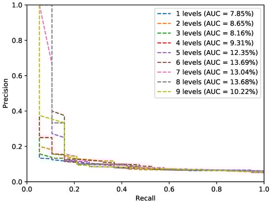 Precision-Recall curves and related Area Under The Curves (AUC) according to the number of levels description used in PHROG when applied on the VPrice dataset.