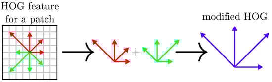 In order to handle the gradient reversals, we restricted a traditional HOG descriptor to a half-size one of which opposed gradient directions are summed (Equations (1) and (2)). This concept is exemplified in Figure 10: in this way, we keep in the descriptor the gradient orientation information without its direction.