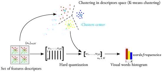 Bag-of-Words approach: a “learning dataset” is first used to cluster extracted features in the descriptor space. Features are then quantified according to nearest cluster. The resulting representation of the images are visual words histograms.