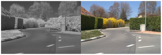 As observed in [], objects in infrared images look different than in color images. Objects globally loose their textures: for example, a screen printing with many colors and shapes seems homogeneous in infrared images (Figure 3). Another noteworthy example is that of vegetation which appears much darker in visible imagery than in infrared one (a landscape looks “snowy” as in Figure 4).