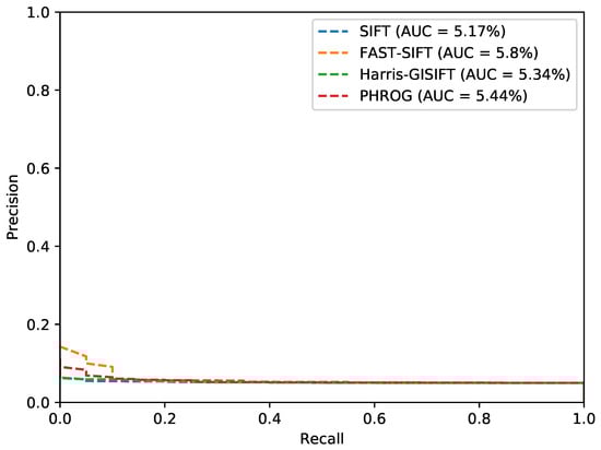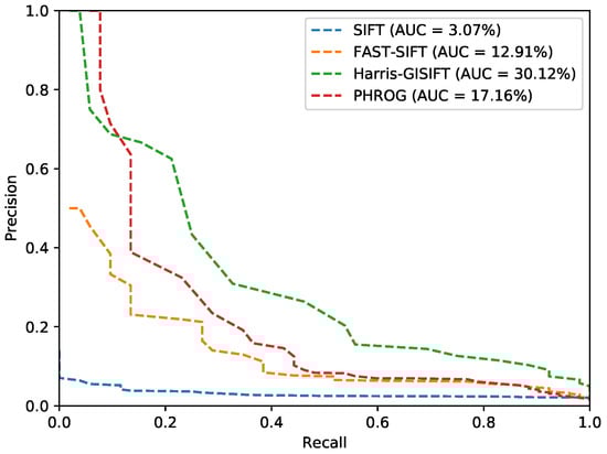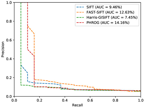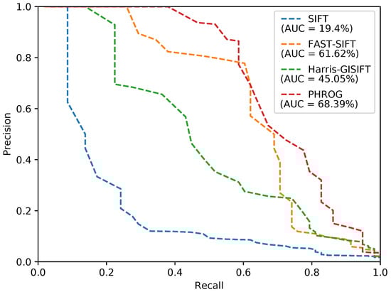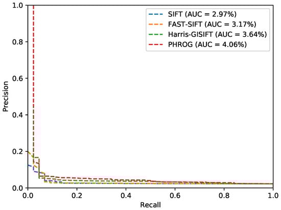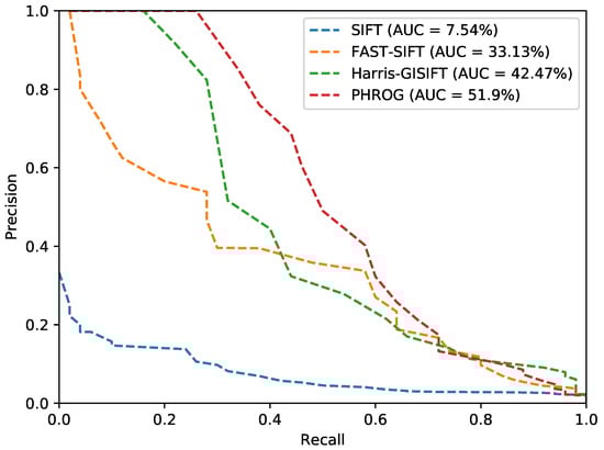 As it can be seen, NIR images are not so different from visible images. It appears that image retrieval with traditional features gives very good matching ratios (see urban and street datasets). By the way, results on country dataset are more disparate: one possible explanation is that vegetation is much more present in this dataset and hence the gradient reversal problem appears more frequently than with building and inorganic matters. PR curves show that PHROG is the best on “urban” and “street” datasets: its AUC is higher by at least than other evaluated methods. On the “country” dataset, PHROG does not hit the best AUC but its precision remains the best when recall is low: it is significant because it means that if the searching process returns only one result, PHROG gives the best answer.
