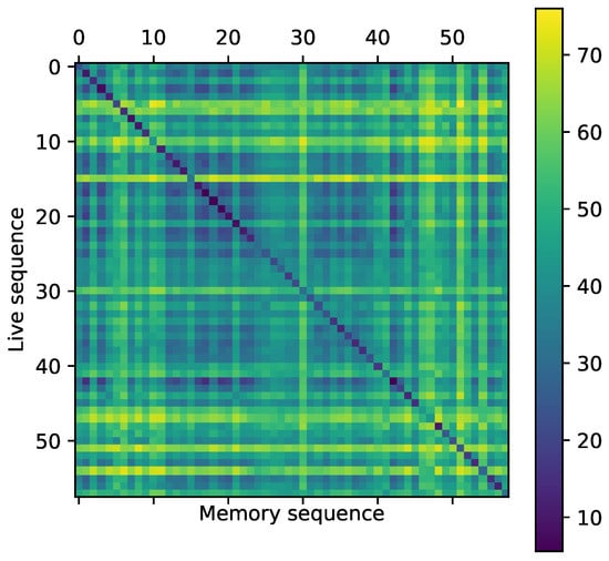 Confusion matrix between the memory sequence and the live sequence from the urban dataset obtained with PHROG. Values in the matrix are the distances computed for each possible image pair.