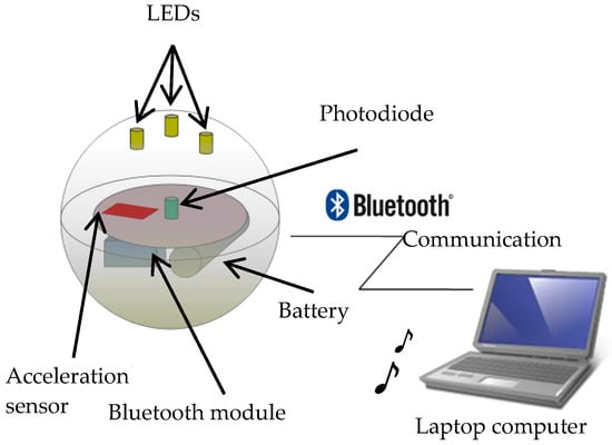 The design of our musical interface, TwinkleBall [28,29], is presented in Figure 2. The main body of the proposed interface consists of a rubber ball, Bluetooth wireless communication module, photodiode, three-axis accelerometer, LEDs, peripheral interface controller (PIC), and battery (9.0 V). All the electronic devices are enclosed in the rubber ball, which is translucent and hollow. The measurement range of the acceleration sensor is ±3.6 g. The peak wavelength of the photosensor is 560 nm. The Bluetooth module, photosensor, three-axis sensor, PIC, and battery are placed on an electronic circuit board inside the core, which is affixed to the rubber ball using rubber sheets. To convert the analogue signal of the sensors into a digital signal, 10-bit A/D conversion is used. The sampling rate of the A/D converter is 550 Hz. The energy autonomy of the device is 1 h. The LEDs are placed on the interior surface of the rubber ball. The specifications of the rubber ball are as follows: diameter, 152 mm; mass, 260 g; material, polyvinyl chloride (PVC). Figure 2 indicates that performers and audiences can easily see TwinkleBall, which shines by virtue of its LEDs and translucent material, even if the performance is staged under low-light conditions. As indicated in Figure 3, the signal output from the photosensor and accelerometer are digitized and sent to an external computer via the Bluetooth wireless communication module. The interval of the communication is set at 35 ms.