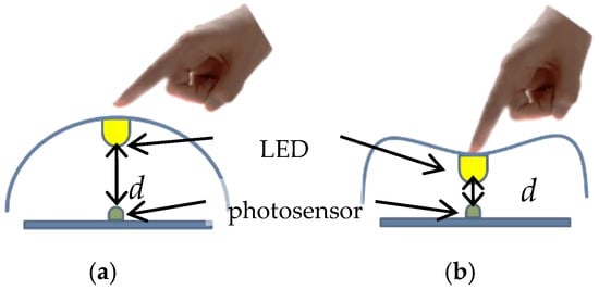 To apply the proposed interface to a dance performance, it is important for the generated sounds to represent bodily motions. In this study, we design the sound application such that the grasping motion controls the note and the moving motion with the interface controls the volume and tempo. We use MIDI sounds as output. In particular, when the shape of the rubber ball changes because of the users’ grasping force, the distance d between the internal photosensor and LEDs varies as illustrated in Figure 4. Because the illumination intensity is inversely proportional to distance d, changes in the grasping force produce different output signals from the photosensor. This output signal is sent to the computer via the Bluetooth module and the note is then tuned based on its value. Because we use MIDI sounds, the range of the note is seven bits. The 10-bit digital signal from the photosensor is normalized into 7-bit before the MIDI output is calculated. Let Pmin and Pmax be the illumination intensity at the maximum distance of d and the minimum distance of d, respectively, and p be the input of the illumination intensity. Then the note is calculated as follows: