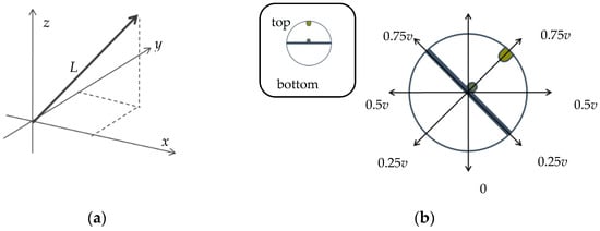 The proposed interface can change sound volume. The measurement value from the acceleration sensor changes when the dancers move the grasping interface through their motions. The accelerometer measures acceleration with respect to the x, y, and z-axes. For noise reduction of accelerometer, we applied a smoothing filter which is based on moving window average of 10 samples. The acceleration values are sent to the computer via the Bluetooth module. The computer calculates three-dimensional (3D) acceleration vector length L using these values and the volume is determined by this length as indicated in Figure 5a. The sound volume range is also seven bits, which corresponds to the resolution of the MIDI velocity. Therefore, the calculated vector is normalized to correspond to this range. The volume does not depend on the direction of movement because we simply use vector length L. Volume control is divided into two cases, namely, static and dynamic. In the dynamic case, where dancers move the interface through their motion, the volume is calculated linearly. In the static case, where dancers do not move, yet grasp the interface, the volume depends on the gradient angle of the interface. Although the interface shape is a sphere, it is divided into top and bottom hemispheres. The volume is determined as indicated in Figure 5b. In this paper, v is set to 60, which is almost half the range of the MIDI velocity determined by exploration in the preliminary experiments. Figure 5 illustrates the case of a 45-degree angle; this corresponds to a volume of 0.75v. Then, L is calculated as follows: