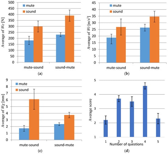 Experimental results. Mute-sound denotes condition “mute” followed by condition “sound”; sound-mute denotes condition “sound” followed by condition “mute”: (a) Result of We; (b) Result of Wt; (c) Result of Wg; (d) Questionnaire results—average score of five (positive) to one (negative).