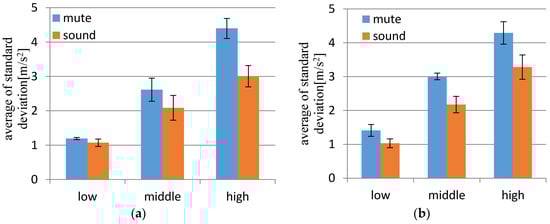 The paired t-test technique (two-sided) was employed for the verification. We tested at the 5% significance level. From the t-test in the case of condition “mute” followed by condition “sound” in Figure 10a, we determined low speed: t(4) = 1.201, p < 0.296; middle speed: t(4) = 2.785, p < 0.049; and high speed: t(4) = 5.587, p < 0.005. From the t-test in the case of condition “sound” followed by condition “mute” in Figure 10b, we determined low speed: t(4) = −2.130, p < 0.100; middle speed: t(4) = −2.835, p < 0.047; and high speed: t(4) = −3.272, p < 0.031. In the case of both low speeds, no significant difference was observed between the results; however, significant differences can be observed in the cases of middle and high speeds.