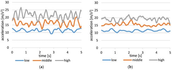 Time sequence results of the magnitude of the accelerations for each target speeds in condition “mute” followed by condition “sound”: (a) condition “mute”; (b) condition “sound”.