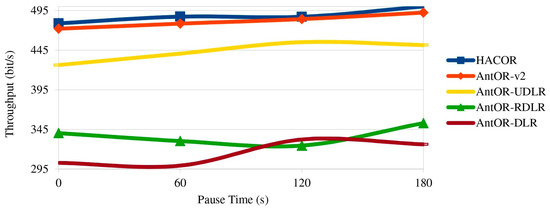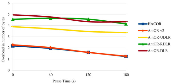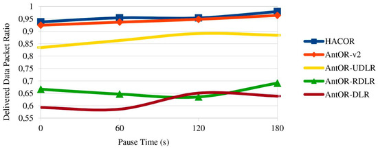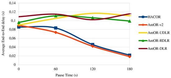 Figure 4 shows the average end-to-end delay. The best values are in HACOR and AntOR-v2 by the good management of obsolete routes. This management purges routes, in order for there to be no conflicts, and thus, the data packets can be sent to destinations, better reducing the delay. Furthermore, the delay is improved with the packet buffering control, since the overlapping of messages sent disappears, because the routes are created before, which makes it more efficient. It is observed that for more static scenarios (higher pause), AntOR-RDLR gets a small improvement in delay than AntOR-UDLR, because it allows proactive ants to go through disjoint routes, up to a certain number of attempts. Instead, the curve of AntOR-DLR presents a more irregular behavior, and it has a higher delay in scenarios that are more dynamic.