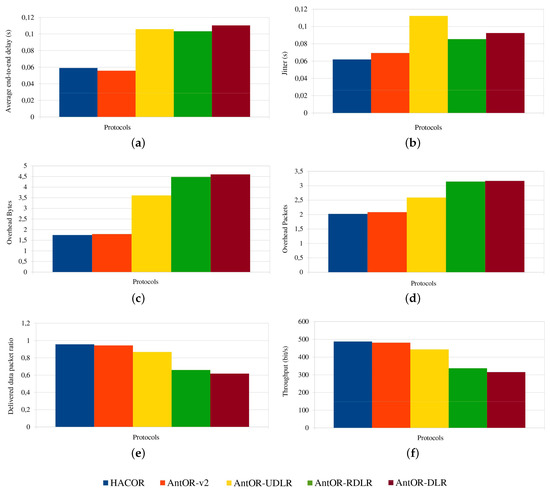 Comparative diagram of the analyzed protocols. (a) Average delay; (b) average jitter; (c) average overhead bytes; (d) average overhead packets; (e) average ratio; (f) average throughput.