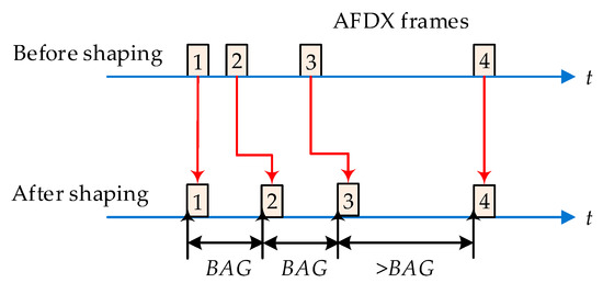 Two methods to measure the end-to-end delay in AFDX are shown in Figure A1b. One is named the A-method, and the other is named the B-method. The beginning time for A-method starts from the point of frame generating, which is denoted as “A” (before BAG shaper) in Figure A1b. For B-method, the beginning time starts from the point that the frame is just in transmission after BAG shaping, which is denoted as “B” (after BAG shaper). Thus, A-method counts the delays by BAG shapers. Generally speaking, the end-to-end delay of a flow in AFDX under A-method must be larger than that adopting B-method except one condition that the frame is not postponed by its BAG shaper because of a big enough arrival interval between the two adjacent frames, such as for frames 7 and 8 in Figure A1b, the beginning time for A-method and B-method is the same (A = B); However, for frames 5, 6, 9 in Figure A1b, A-method will get a bigger measurement result than B-method. Furthermore, the bigger the generating jitter is, the larger the difference between A-method and B-method should be. In this paper, we adopt the B-method to measure end-to-end delays in AFDX.
