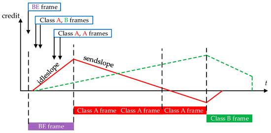 The corresponding credit allocated to a given class starts at 0. It decreases at the rate of sendslope when a frame from this class is being transmitted. After the transmission, it increases at the rate of idleslope. If the credit has grown to zero and there are no frames waiting in the corresponding queuing buffer, then the credit will be set to zero and wait for frames coming. If the transmission of SR class frame is blocked, its credit keeps growing at the rate of idleslope and can exceed 0. Under this mechanism, SR class frame is scheduled according to priority strategy with CBS algorithm. The usage of sendslope and idleslope provides great flexibility for Ethernet-AVB flow control. Sendslope and idleslope are deduced from the bandwidth fraction allocated to the class, and should obey sendslope = idleslope − linkspeed. Usually, the physical link speed is 100 Mbps. If we want to accelerate the transmission speed for some kind of SR class flows, we can increase the corresponding idleslope to ensure its credit to recover quickly. On the other hand, if we want to slow down the transmission speed, we can decrease its corresponding idleslope.