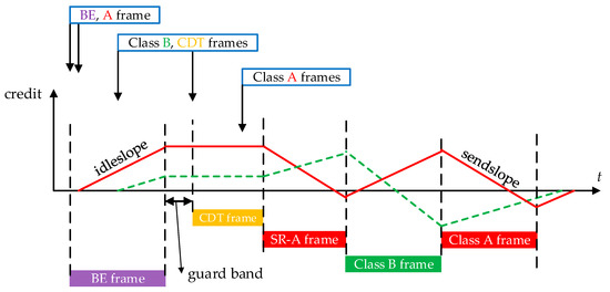 With TAS mechanism, the original scheduling strategy and CBS shaper function in AVB should make some modifications. Scheduler first checks time-aware transmission gates during the whole scheduling process. In CDT gates opening windows, only the corresponding CDT class frames can be sent out. Credits associated to AVB SR are frozen during these windows as the corresponding SR gates are closed. In SR gates opening windows, SR frames can be scheduled out according to AVB CBS algorithm. One example of the CBS rule in TAS is illustrated in Figure 3. We can also find the guard band in Figure 3 since it shows the non-preemption mode for SR frame queuing behaviors. If the preemption mode is considered, the credit consuming and recovering process are different from Figure 3.