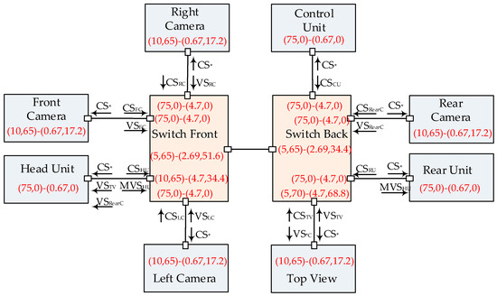 Eight end systems are connected to two Ethernet-AVB switches: Switch Front (SF) is in charge of flow forwarding within the front part and Switch Back (SB) is for the back part. Four automotive cameras are integrated for driver assistance: one is in front of the car, one is in the back, and the other two are installed at each side (Left Camera: LC and Right Camera: RC). These cameras gather Video Signals (VS) and then send them to Top View (TV). TV end system merges all these four video signals and then sends resulting video signal to Head Unit (HU). HU end system displays these results simultaneously with Rear Camera (RearC) video signal. Besides, HU emits additional Multimedia Video Signal (MVS), such as navigation information, to Rear Unit (RU). Control Unit (CU) is in charge of the whole network management and all Control Signals (CS) are broadcasted to every end system. Idleslope parameters for SR-A and SR-B and the actually total load per class are also shown in Figure 4. For example, for Right Camera, the idleslope of SR-A class is 10 Mbps and the idleslope of SR-B class is 65 Mbps. The actual total load of SR-A is 0.67 Mbps and the total load of SR-B is 17.2 Mbps. All of these idleslope settings were taken from [29].