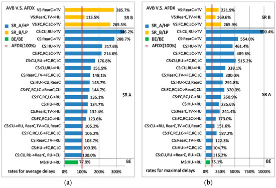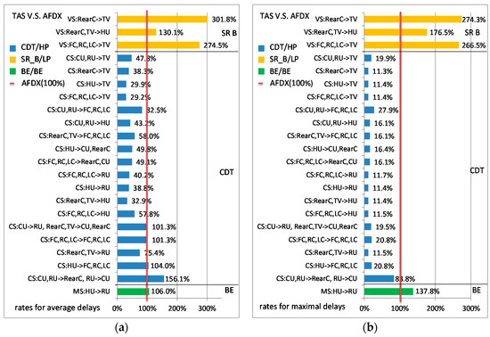 As the nature of time-triggered mechanism, all CS flows in TAS obtain perfect transmission stableness. The maximal delays of CS flows are quite close to their average delays. For example, the average delay of flow CSFC→TV is 45.8 µs and the maximal delay is 46.0 µs, which constitute the average delay ratio as 29.2% and maximal delay ratio as 11.4% in contrast to AFDX ones (shown in Figure 7). The difference between the average delay the maximal delay mainly lies in the precision of time synchronism. Besides, different arrangements of CDT scheduling windows will bring different end-to-end delays. This influence not only affects the delays of CDT priority flows, but also affects the delays of other priority flows. For SR-B flows, the average delay and maximal delay of every VS flow in TAS are larger than the corresponding delays in the standard Ethernet-AVB, as well as larger than those in AFDX. For example, the ratio for flow VSReac→TV in the comparison of AVB versus AFDX is 115.5% (shown in Figure 6a) in contrast to 130.1% (shown in Figure 7a) in the comparison of TAS versus AFDX. In this case study, AFDX gives smaller average delay and maximal delay for BE flows than TAS does. Since the final delays of SR-B and BE flows seriously depend on the arrangements of CDT gates opening windows, we mainly focus on the comparison between the standard Ethernet-AVB and AFDX in the following sections.
