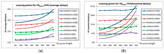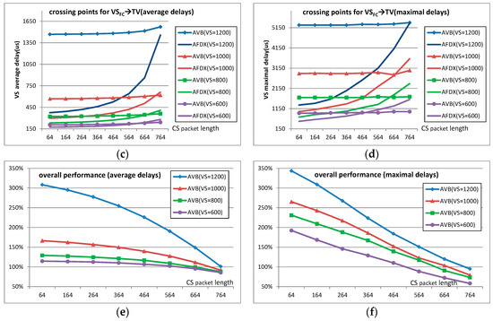 Figure 8a,b, shows the average delay differences and maximal delay differences for flow VSReaC→HU in AVB and in AFDX; Figure 8c,d shows these delay differences for flow VSFC→TV; and Figure 8e,f gives, respectively, the average delay ratios and maximal delay ratios for SR-B flows in Ethernet-AVB compared to LP flows in AFDX (there are 5 unicast VS flows and one multicast flow). We can observe that delays in both Ethernet-AVB and AFDX increase with a large CS frame length, but the incremental quantity in Ethernet-AVB is much smaller than that in AFDX. In other words, the transmission in Ethernet-AVB is more stable than in AFDX. For example, the delay variation of VSReaC→HU with 1200 bytes in AVB is 9.0% (increasing from 389 µs to 424 µs, Figure 8a) when CS packet length changes from 64 bytes to 764 bytes. However, the corresponding delay variation of VSReaC→HU in AFDX is 36.1% (increasing from 327 µs to 445 µs in Figure 8a). For flow VSFC→TV with 1200 bytes, the delay variation in AFDX is even large as 288.8% (increasing from 375 µs to 1458 µs in Figure 8c) in contrast to 7.2% (increasing from 1468 µs to 1573 µs in Figure 8c) in AVB with respect to the same load increasing of CS flows from 64 bytes to 764 bytes. This difference finally leads to performance crossing points between these two network solutions, not only for the average delay criteria, but also for the maximal delay criteria. For the case with small CS frame length, AFDX is better than Ethernet-AVB, as it was the case for the original study in Section 4.2. However, Ethernet-AVB becomes better for a large frame length. For example, when VS frame length is 1200 bytes, the performance crossing points of flow VSRearC→HU are around at 700 bytes (CS packet length) both for the average delay comparison and the maximal delay comparison. If VS is set with a smaller frame length, the performance crossing point will come earlier. For example, if VS frame length is 600 bytes, the crossing points are around at 550 bytes (CS packet length) for average delay and 460 bytes (CS packet length) for maximal delay.
