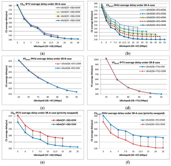 Besides, it is a good way for the analytic method to explain the varying trend of CBS shaping benefits. According to Equations (10) and (24), the maximal transmitted bits amount and the shaping benefit have no direct relationship with SR-B idleslopeB. Thus, the shaping benefits for flow CSFC→TV (priority swapped) at different idleslopeB settings from idleslopeA = 65 Mbps to idleslopeA = 55 Mbps nearly keep the same, which are shown in Figure 9e. In addition, the differences among different shaping benefits for flow CSRearC→HU (priority swapped) at different idleslopeB settings between the curve of idleslopeA = 65 Mbps and the curve of idleslopeA = 35 Mbps basically hold a similar gap shown in Figure 9f. This kind of varying trend is quite different from the shaping benefit from SR-B to SR-A, as shown in Figure 9a,b. We can observe that the benefit differences get bigger with the increase of idleslopeA setting. In fact, both the equivalent logical maximum of bursts and the shaping benefit are directly related with idleslopeA setting according to Equations (20) and (26). A bigger idleslopeA will bring a larger and consequently results in a bigger burst incremental and this incremental finally constitutes the increasing gap trend among different idleslopeB curves.
