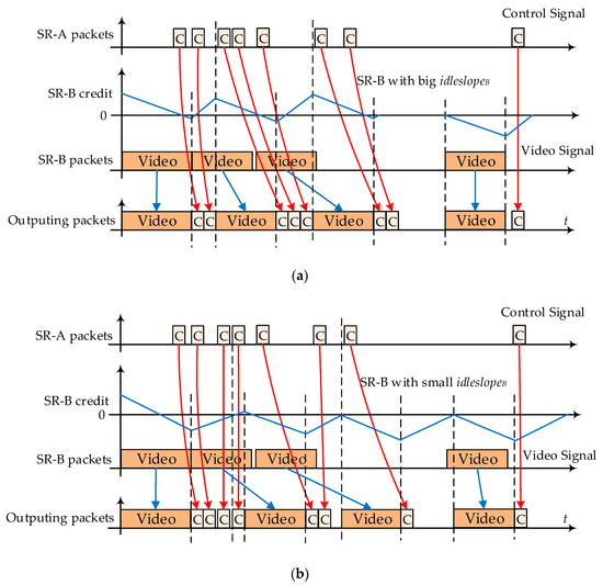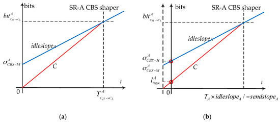 According to the subtraction operation in Equation (15), the shaping envelope with serialization effect for SR-A CBS can also be obtained by moving the ordinate in Figure 9a a specific length to the right as , which is shown in Figure 11b. The initial value of the moved shaper curve is our equivalent maximum burst . In Figure 11b, the C speed line starts from . The time of the crossing point between C speed line and idleslopeA line is since it already has one frame ready.