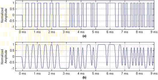AIS digital message sequence and Gaussian baseband waveform. (a) AIS message digital sequence waveform; and (b) Gaussian minimum shift keying (GMSK) baseband wave form.
